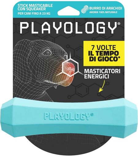 Meet the Squeaky Chew Stick by Playlogy: With a fun squeaky sound and seductive peanut butter scent, thanks to our Encapsiscent technology, this is the dog toy your puppy has been waiting for. In addition, it is designed to float, so it is not only great for the garden or park, but also for playing in the water in a pool, pond, lake or beach. The medium size is ideal for dogs up to 50 lbs.Powerful technology: a dog's sense of smell is 10,000 times stronger than a human. Dogs experience the world through fragrance, which is why we make dog chew toys with the natural scents they love. Each Playology dog toy is integrated with an all-natural scent at the microscopic level. The fresh scent bursts that are released with each chew will keep your pup engaged 7 times longer than unscented toys.EASY TO CLEAN - Dirt and sand trapped on the surface of a toy can grind your puppy's teeth, which is why we make all our rubber toys easy to clean. With our Encapsiscent technology, the all-natural fragrance is built into the entire material of each toy, so no need to worry about washing off the scent your puppy loves. Simply rinse with warm water to clean and dry.Founded by Dog Lovers: When we developed Playology, we looked at the science behind what made dogs enjoy their toys. We have reviewed the safety standards used to protect human children and designed our dog toys using these standards. Each Playology toy is tested to meet ASTM safety guidelines and CPSIA standards for leads, phthalates and other toxins deemed hazardous. Everyone at Playology remains committed to designing and developing the best, safest and healthiest toys possible!.GUARANTEE OF HAPPINESS - At Playology, we are more than toys; we want to make tails wagging and end the graveyard blues. So if you have any problems or your furry friend is not happy with our products for any reason, we are here to save the day. Your dog's happiness is our guarantee! ...