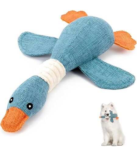 Safe and Squeaky Fun The squeaker is hidden in the body of the wild dog toy. Your dog will walk around the house and carry it in his mouth to squeak. Great toy that also squeaks other dogs in the neighborhood as it will.Proper Size The length of the indestructible dog toy is about 32 cm/ 12.6 inches, making it perfect for small to medium dogs and puppies to play, cuddle or chew. Your dog will enjoy playing with these toys.Squeaky Dog Toy: indestructible, safe and squeaky dog toy. The squeaker is hidden in the body of the wild goose toy. Your dog walks in the mouth, lies with him and shakes him to squeak.IDEAL PUPPY TOY This small chew toy for aggressive chewers, durable and super soft plush design with special convex and concave sides can help puppies teeth better, chew, brush teeth, play and protect their gums and relieve stress or discomfort.VERSATILE INTERACTIVE DOG TOY - The best pet accessory, sturdy toy for many uses. The long neck of the goose filled dog toy is ideal for pulling, biting, pulling and perfectly accompanying animals such as cuddling, pillows, sleeping. The owners throw it away, and the dogs hunt and collect the dogs. It is the best toy that enhances close relationships and personal entertainment. ...