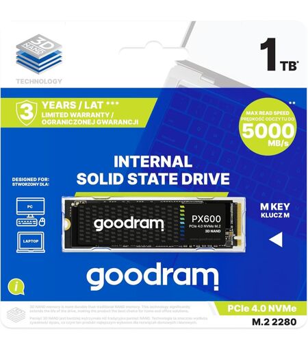 Grâce à la technologie NAND 3D, le PX600 offre une utilisation optimale et une densité de mémoire. MTBF de 2 heures MLN garantit une fiabilité à long terme. Vitesses de lecture 5000 Mo/s en écriture 4200 Mo/s en font l'un des SSD les plus rapides.Dernière technologie NVMe dans Goodram PX600. L'utilisation de Flash NAND 3D accélère le fonctionnement de la mémoire et du contrôleur. Les retards limités et la file d'attente permettent des performances au-delà du SSD AHCI.Thermal throttling - Limitation de performance due à des températures élevées, souvent sur les SSD M.2 NVMe. Le contrôleur PX600 gère efficacement les tensions. Fiabilité élevée, même en cas de charge matérielle élevée.Un disque dur Le Goodram PX600 est disponible en 250 Go, 500 Go, 1000 Go et 2 000 Go, le tout au format M.2 2280 avec une disposition de composants unilatérale.Goodram -Les disques durs sont soumis à des contrôles de qualité approfondis à chaque étape de la production. Chacun est entièrement testé après la fabrication pour garantir que seuls les produits de première classe parviennent à nos clients. ...