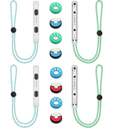 [Package includes]You will receive 2 pairs of Joy-Con Gamepad Lock Lanyard for Switch Controller. Equipped with 4 cat claw joystick caps and 4 poké ball joystick caps, which can increase the friction between your fingers and the controller, providing you with a more enjoyable gaming experience!.[Easy to Use]The gamepad strap is compatible with NS Switch controller, has the same guide as the and can be easily installed by ""sliding""; There is a locking buckle at the end of the Switch bracelet, which can better repair the game controller.[High Quality Material] The switch strap is made of high quality ABS material, soft and comfortable, soft touch non-slip surface provides better grip and prevents your fingers from slipping at critical moments, making your game more fun!.[Switch Handle Features] Clear marks, - prevent improper installation of the Joy-C handle, and the oversized light signal provides more instructions. It also features upgraded SL and SR buttons with auto lock and premium sliding materials.[Better Experience] If you play sports games, you can attach the controller strap to the Joycon Switch for more safety. You can play any sports game and enjoy the perfect living room console experience. ...