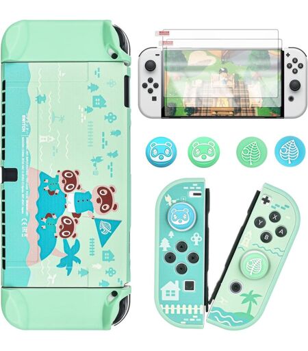 [DOCKABLE CASE FOR OLED Switch]Specifically designed for Switch OLED, which can provide excellent protection for your Switch OLED. The all-new Turquoise Animal Crossing theme makes your Switch OLED stand out from the crowd.[Easy to Use and Install]Split design, easy to install and remove. The cover of the left and right Joy-Cons can be removed freely without removing the Switch console from the case. ( Press the bottom edge of the case to fix the OLED Switch in place).[Premium Durable Material]Made of high quality PC material, the sturdy cover of the Switch OLED prevents daily bumps, drops, scratches, dust, and extends the life of the device. Ergonomic skin design gives you a better gaming experience while playing.[Comes with 2 Screen Protectors]HD tempered glass screen protector and installation kit are easy to install and bubble-free. High definition with 99.9% transparency provides a clear display and effectively protects the entire screen.[Dockable Protective Case]Perfectly adapted to the OLED dock, so you can attach the dock to charge or connect the TV without removing the case. Some Switch docks are tighter, so the case could not be dockable. It is therefore recommended to choose a medium thickness screen protector compatible with the dock. ...