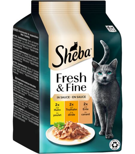 12x50g Fresh & Fine, poulet dinde et canard en sauce Sheba pâtée pour chat