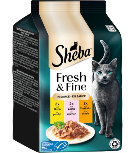 12x50g Fresh & Fine, poulet saumon et dinde en sauce Sheba pâtée pour chat