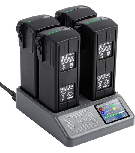 Conception personnalisée STARTRC Concentrateur de charge spécialement conçu pour DJI Mavic 3 Pro/Mavic 3 Classic/Mavic 3 Cine/Mavic 3, batterie de vol intelligente de la série Mavic 3.Deux Modes de Chargele mode de charge de stockage d'énergie prend en charge 60% de la charge et le mode de charge complète prend en charge 100% de la charge. Une batterie entièrement chargée en vert évite la surcharge. Le chargeur peut arrêter la charge à 98 ou 99%, ce qui est bénéfique pour la sécurité et la durée de vie de la batterie.Protection de charge La station de charge dispose de fonctions de sécurité pour protéger contre les surcharges, les surtensions et les courts-circuits, assurant la sécurité de vos batteries et de vos appareils. Suggérez d¿utiliser un chargeur rapide de 65 W pour obtenir une charge efficace de 75 minutes.Chargeur de batterie rapideIl peut charger quatre batteries dans l'ordre décroissant de charge, ce qui évite de brancher et de débrancher plusieurs piles. et prend en charge la charge rapide PD.Chargeur de batterie LCDDétection automatique, hiérarchisation de la charge à haute capacité de la batterie ; l'écran de la station de charge affiche l'ancienne, le courant, la puissance, le temps de charge, la capacité de la batterie, la température de la batterie, la barre de progression de charge et le pourcentage de charge de la batterie.PortableConvient pour différents types de sacs de rangement et de sacs à dos de drones, taille compacte et pratique à transporter. Le filet intelligent assure la saturation de la batterie tout en réduisant la température de charge de la batterie, ce qui protège efficacement la durée de vie de la batterie.Contenu de la livraison1 station de charge avec écran LCD. 1 câble de données USB-C/C. (Remarque piles / câble de sortie USB non inclus).La livraison depuis la France est prévue dans 5 jours ouvrés, n'hésitez pas à passer votre commande ...