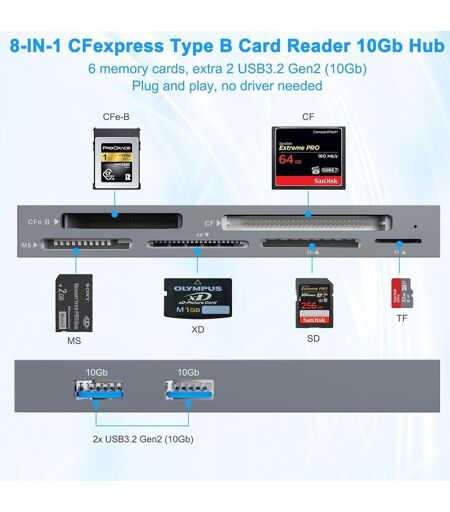 CMJAAGUR-Lecteur De Carte Express Type B Avec Usb 3.2 Gen 2 10Gpbs, 8 En 1 Usb-C/Usb-A Type B Express Adaptateur Compatible Avec Express Type B/Sd/Tf/ /Xd/Ms/Usb, Lire 6 Cartes Et 2 Usb Simu[M1645]