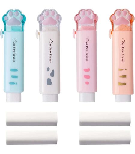 Lot de 4 gommes rétractables en forme de patte de chat avec 4 recharges Papermate-Design Kawaii pour enfants et filles-Gommes esthétiques en caoutchouc-Fournitures scolaires