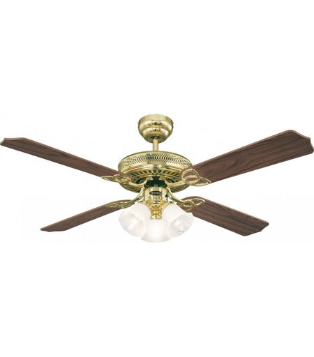 Dimensions et données techniques 220-240 V ~ 50 Hz Diamètre : 132 cm Couleur du bloc moteur : laiton poli Couleur des pales : chêne avec rotin / acajou (réversibles) Inclinaison des pales : 11° Eclairage : utilise 3 x E14 ampoules, max 3 x 60 W (ampoules non incluses dans la livraison) Consommation du moteur : 26 / 40 / 59 W Tours par minute : 75 / 120 / 175 Débit d'air : 163 m³/min Efficacité : 49 dB(A) Plafond au pales : 29 cm Hauteur totale : 43 cm Diamètre du cache de fixation : 13 cm Inclinaison du plafond : 18° max. Fonction été / hiver (rotation en avant et en arrière) par interrupteur sur le boîtier Commande par tirettes : éclairage on / off, 3 vitesses / off Poids : 6,5 kg ...