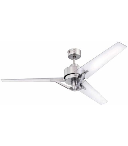 Dimensions et données techniques 220-240 V ~ 50 Hz Diamètre : 137 cm pour les pièces jusqu'à 36 m² Couleur du boîtier : nickel brossé (métal) Couleur des pales : transparent (acrylique) Inclinaison des pales : 12° Consommation du moteur : 17 / 29 / 57 W Tours par minute : 96 / 137 / 194 Débit d'air max. : 184 m³/min Efficacité : 3 m³/min/W Niveau sonore : 56 dB(A) Pales au plafond : 31,3 cm Hauteur totale : 41,8 cm Diamètre du cache de fixation : 13 cm Inclinaison du plafond max. : 15° Fonction été / hiver (rotation en avant / en arrière) sur le boîtier Télécommande incluse : 3 vitesses / off Poids : 8,5 kg ...