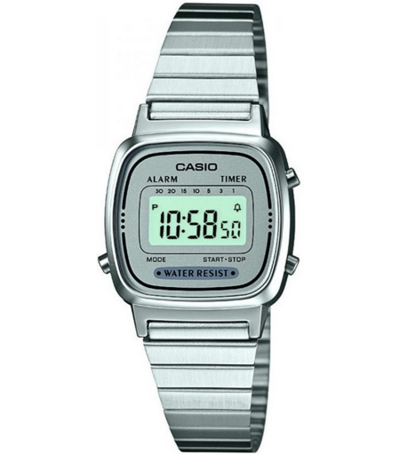 3Suisses : Cette montre ultra classique Casio LA670WEA-7EF est réalisée en acier inoxydable. Elle dispose d'un affichage digital avec alarme, chronographe et compte à rebours. Ce bijou pour dame reflète l'esprit de sa collection : Rétro Vintage. Type: Montre Marque: Casio Genre: Femme Styles: Mode Age: Adulte Couleur du bracelet: Argent Mouvement: Quartz Fonctionnalités: Alarme, Chronographe, Dateur, Compte à rebours Matière Bracelet: Acier Conditionnement: Ecrin de la marque Garantie: 2 Ans Type de garantie: Fabricant Affichage: Digital Matière Boitier: Résine Forme de Boitier: Rectangulaire Couleur du cadran: Gris Verre: Minéral Type Fermeture: Boucle déployante Diamètre Boitier: 27 mm ...