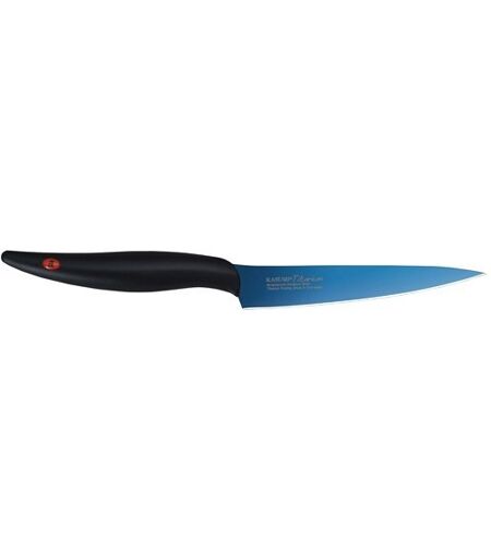 Ce couteau d'office Kasumi Titanium possède tous les avantages de la céramique sans les inconvenients Lame acier 12 cm à hauteur de 0,8% de carbone + molybdène et vanadium Dureté rockwell 58°HRC Revêtement en nitrure de titane bleu neutre au goût, anticorrosif et léger Manche design en plastique antibactérien facile d'entretien Aiguisage ambidextre en V pour un angle de 30° cumulé ...