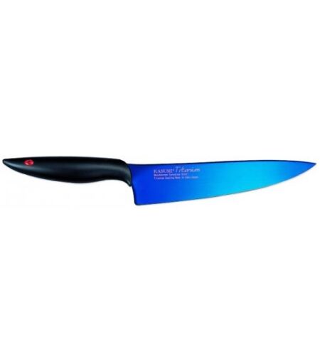 Ce couteau de chef (ou Gyuto) Kasumi Titanium possède tous les avantages de la céramique sans les inconvenients Lame acier 20 cm à hauteur de 0,8% de carbone + molybdène et vanadium Dureté rockwell 58°HRC Revêtement en nitrure de titane bleu neutre au goût, anticorrosif et léger Manche design en plastique antibactérien facile d'entretien Aiguisage ambidextre en V pour un angle de 30° cumulé ...