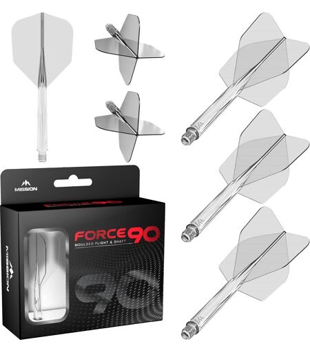 Mission Darts Force 90 \u2013 Flight and Shaft System intégré.Ressentez la force de la Mission Force 90 \u2013 un système de vol et d'arbre entièrement intégré Fabriqué à partir de matériaux de haute qualité et durables, le Force 90 gardera un angle parfait de 90 degrés entre les ailerons du vol pendant le jeu, offrant aux joueurs une trajectoire de vol cohérente à chaque fois.La Force 90 est à la pointe de la durabilité et de la résistance avec ces ailettes fabriquées à partir de matériau composite de haute qualité, donnant à chaque joueur la tranquillité d'esprit d'avoir une performance constante à chaque lancer.Les ailettes sur le Force 90 disposent de bords lisses pour aider à réduire les déviations pendant le jeu et les fait trancher l'air pour promouvoir une trajectoire plus vraie et plus précise.Disponible en trois formes différentes (n° 2. 6 et mince) et chacune en trois longueurs (courte, tweenie et moyenne) pour répondre aux préférences de tous les joueurs. Également disponible en plusieurs couleurs. ...