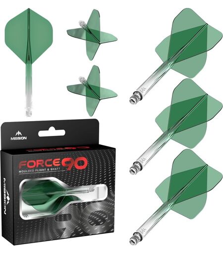 Mission Darts Force 90 \u2013 Flight and Shaft System intégré.Ressentez la force de la Mission Force 90 \u2013 un système de vol et d'arbre entièrement intégré Fabriqué à partir de matériaux de haute qualité et durables, le Force 90 gardera un angle parfait de 90 degrés entre les ailerons du vol pendant le jeu, offrant aux joueurs une trajectoire de vol cohérente à chaque fois.La Force 90 est à la pointe de la durabilité et de la résistance avec ces ailettes fabriquées à partir de matériau composite de haute qualité, donnant à chaque joueur la tranquillité d'esprit d'avoir une performance constante à chaque lancer.Les ailettes sur le Force 90 disposent de bords lisses pour aider à réduire les déviations pendant le jeu et les fait trancher l'air pour promouvoir une trajectoire plus vraie et plus précise.Disponible en trois formes différentes (n° 2. 6 et mince) et chacune en trois longueurs (courte, tweenie et moyenne) pour répondre aux préférences de tous les joueurs. Également disponible en plusieurs couleurs. ...