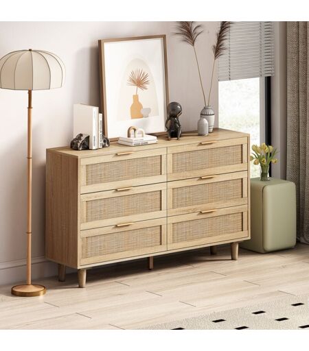 MODFU Commode 6 tiroirs, buffet, meuble de rangement, salon/chambre, design rotin - 130 x 40 x 75 cm, naturel