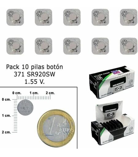 Pile Bouton Oxyde d'Argent 371/SR920SW (Boîte de 10 Piles) Boîte avec 10 piles. Tension : 1,55 v. Pour les applications nécessitant une consommation d'énergie constante : montres, calculatrices, petits électroménagers. Piles fabriquées sans mercure. Pile bouton oxyde d'argent - Boîte de 10 piles. - Tension : 1,55 v. - Pour les applications nécessitant une consommation d'énergie constante : montres, calculatrices, petit électroménager. - Piles fabriqué sans mercure. ...
