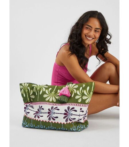 Big enough for all the beach essentials (think towel, sunnies, SPF, water bottle and book), this bag is a real staple for summertime. Patterned with colourful palm trees, it features XL tassels in green and pink dangling from the sturdy handles. Finished with a zip fastening and internal slip pocket. Outer 100% Cotton. Lining 100% Polyester. ...