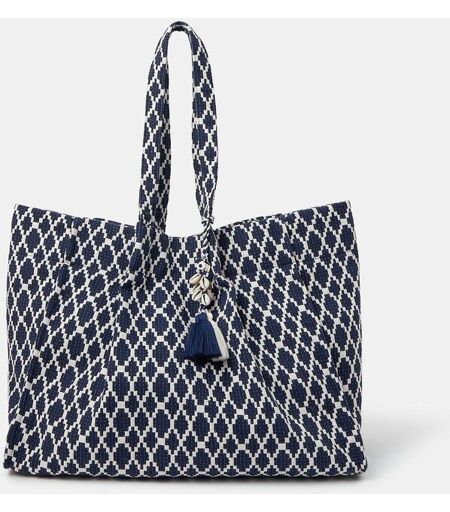A bold choice for carrying all your summer holiday essentials, this tote bag is woven with geometric patterns in a colour to match the deep ocean waters. Features a magnetic button fastening and seashell tassel charms dangling from the shoulder straps. Main 60% Cotton, 30% Polyester, 10% Viscose. Lining 100% Polyester. ...