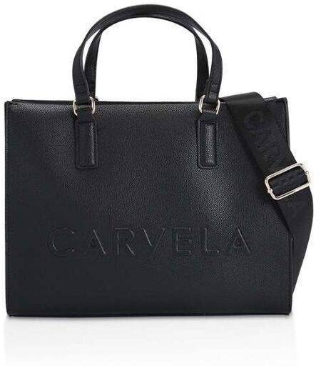 The Carvela Frame Midi Tote bag features a grey exterior with slight texture. The front is embossed with the Carvela logo. Dimensions: 23cm (H), 30cm (L), 12cm (D). Strap length: 123cm. 100% Synthetic rubber. ...