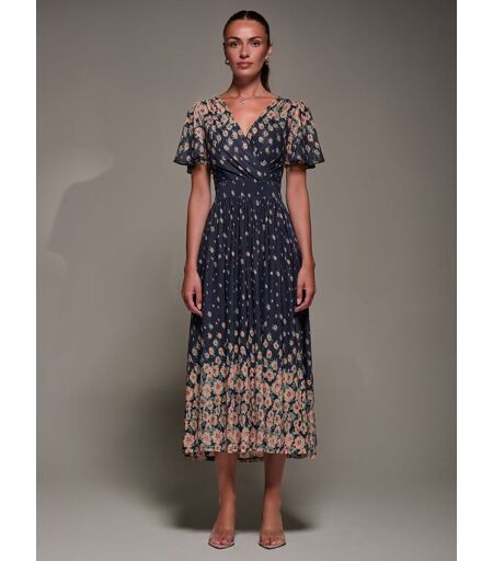 The Mirrored Mesh Short Sleeve Midaxi Dress by Jolie Moi features a flattering wrap-style front with a V-neckline. The short, flowy sleeves add a touch of femininity. The thicker waistband enhances the waist, while the skirt is gently gathered, creating soft movement and a flattering drape. With its slightly shorter front hemline and practical side pockets, this dress is perfect for both casual and formal occasions. Machine washable. 95% Polyester, 5% Elastane. ...