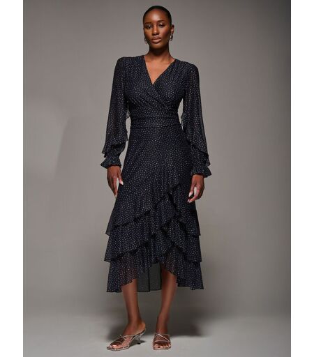 Long Sleeve Frill Detail Mesh Maxi Dress by Jolie Moi features a flattering wrap-style front with a soft V-neckline. Designed with delicate gathers at the side waistband for a beautifully draped silhouette. The skirt flows into a three-tiered frill hem with an asymmetric finish. Long sleeves are finished with elasticated cuffs that subtly flare at the wrist, adding a soft, feminine touch. Perfect for special occasions or standout evenings. Model's height - 170cm, and wears size 8. Length - 133cm ...