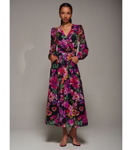 Long Sleeve Printed Lace Midaxi Dress by Jolie Moi features a wrap-front V neckline, long sleeves with fitted cuffs, and gentle gathers at the waistband for a soft, draped look. Pleated details along the waistline and a tie to cinch the waist, while two side pockets add a practical touch. The model is 170cm and wears a size 8. Length: 129cm. Lavable en machine. 90% Polyester, 10% Elasthanne. ...