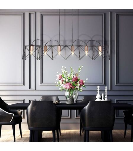 Description Lampe à suspension design cage pour votre salon. Cette lampe de couleur noire avec des douilles couleur cuivre attirera tous les regards et celui que vous avez choisi Donnez un nouveau style à votre espace de vie. Cette lampe suspendue fait particulièrement bonne figure au-dessus de la table dans le salon, la salle à manger ou la cuisine Éclairez de manière optimale l'emplacement choisi. Les lampes ne sont pas incluses dans la portée de livraison. Détails de la lampe • lampe type : lampe suspendue • matériau : acier• couleur : noir • couleur des douilles : cuivre • classe de protection : IP20• longueur base x largeur x hauteur en cm : 30,3 x 6,3 x 2,5 • longueur abat-jour x largeur x hauteur en cm : 108 x 19 x 19 • Hauteur totale en cm : 145 • douilles : 6x E27 • ampoules incluses ancien : non • ampoules de puissance : max 6x 10 watts • alimentation : 220-240V, 50-60Hz ...