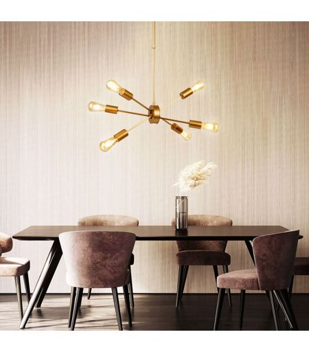 Description Cette lampe extraordinaire sera un nouvel accroche-regard dans vos quatre murs. Fabriqué en métal et tenu en or mat, la lampe apporte une nouvelle touche à votre espace de vie choisi. Les six douilles sont déployées en étoile et assurent ainsi une répartition lumineuse dans toutes les directions. Equipé de six douilles E27, vous pouvez utiliser des lampes avec une puissance maximale de chaque Utilisez 60 watts et déterminez ainsi vous-même la couleur et l'intensité de la lumière. En raison des économies d'énergie et de la longévité, nous recommandons l'utilisation de sources lumineuses à LED. Les sources lumineuses ne sont pas incluses dans la livraison. Détails lampe • type de lampe : Lampe à suspension• Matériau : métal• Couleur : or, mat• Classe de protection : IP20• longueur x largeur x hauteur abat-jour en cm : 53x23x70• hauteur totale en cm : 107 • douilles : 6x E27 • ampoules incluses : non• ampoules de puissance : 6x 60 watts max.• alimentation : 220-240V, 50-60Hz ...