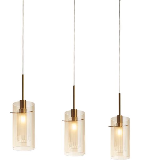 Suspension barre 3L DUO I métal Bronze et double Verre Champagne E14 3x60 w max. Sublimez votre intérieur avec la suspension barre 3L DUO III en métal bronze et verre champagne. Son design élégant mêle une structure en acier finition bronze à trois abat-jour cylindriques en verre double, pour un rendu à la fois chic et chaleureux. Chaque diffuseur arbore un motif émaillé raffiné qui crée un jeu subtil d’ombres et de lumière, apportant profondeur et caractère à votre pièce. Réglable en hauteur, ce luminaire s’adapte parfaitement au-dessus d’une table à manger, d’un îlot central ou dans un salon. Alliance parfaite entre style classique et contemporain, il s’intègre aussi bien dans un décor moderne que plus traditionnel. Fonctionne avec ampoules E14 3x60W max (non fournies). ...