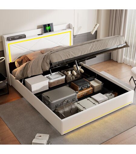 TANANT Lit coffre 140x190 cm, lit double avec sommier à lattes, tête de lit avec éclairage led et port de charge usb, simili cuir, design moderne - Beige