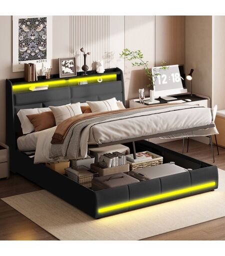 TANANT Lit coffre 160x200cm, lit capitonné avec sommier à lattes, avec éclairage led et port de charge usb, rangement, design moderne, Noir