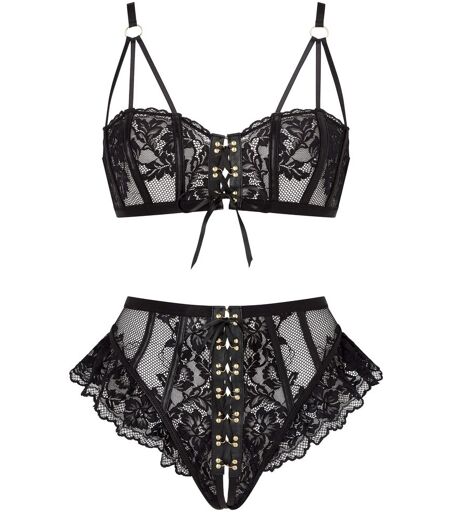 Become the star of the show in our Boudoir Tease Crotchless Set. Made from a chic combination of lace, mesh and PU binding for an erotic edge, this two-piece set includes a bra and knicker. The bra is made with non-wired, non-padded cups with nipple skimming coverage and over-bust strapping. Eyelet lace up detail leads through the centre front to the crotchless opening and the back whilst the lace frill emphasises the hips. Wear yours on an evening in to have all eyes on you. Lavage à la main un ...