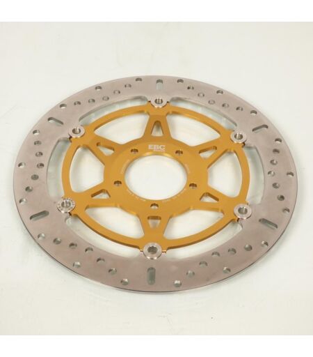 Disque de frein avant flottant neuf adaptable de marque EBC référence MD843X en acier inoxydable coloris gris et frette aluminium coloris or. ATTENTION plusieurs modèles existent merci de bien vérifier que le votre soit identique (exemple : épaisseur, trous de fixations chanfreiné ou pas,...) Caractéristiques : - Position : Avant - Diamètre extérieur : 320mm - Diamètre intérieur : 72mm - Épaisseur : 5mm - Nombre de trous de fixations : 5 - Trous de fixations : NON chanfreiné - Diamètre des trous de fixations : 8.5mm - Entre axe des trous de fixations : 90mm - Entre axe des trous de fixations cote à cote : 53mm - Entre axe des trous de fixations en diagonale : 85.8mm - Déport : 10mm Depuis sa sortie, le disque de frein avant flottant X-series ultraléger d'EBC Brakes est devenu l'un des, voire le disque le plus vendu, le plus léger et le plus performant disponible pour toutes les motos sportives ...