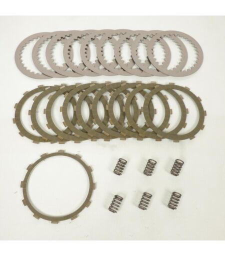 Kit disque d'embrayage neuf adaptable de marque EBC série SRK Race/Sport. - Comprend disques garnis revêtus en fibre aramide, disques lisses et ressorts renforcés (rigidité +10%) - Tous les kits sont conçus pour supporter les rigueurs d'une utilisation urbaine et de course intensive Ce kit comprend : 9 Disques garnis dimensions : - Diamètre intérieur : 126.5mm - Diamètre extérieur : 150.5mm - Diamètre extérieur sur dents : 160.5mm - Épaisseur : 3mm - Nombre de dents : 12 1 Disque garni dimensions : - Diamètre intérieur : 135.5mm - Diamètre extérieur : 150.5mm - Diamètre extérieur sur dents : 160.5mm - Épaisseur : 3.8mm - Nombre de dents : 12 9 Disques lisses dimensions : - Diamètre intérieur : 126mm - Diamètre intérieur sur dents : 115.7mm - Diamètre extérieur : 150.8mm - Épaisseur : 2mm - Nombre de dents : 30 6 Ressorts : - Diamètre ...