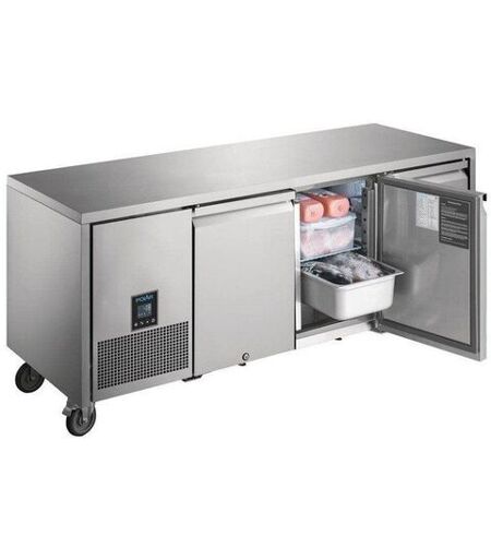 La table réfrigérée négative trois portes Polar Série U Premium est une solution polyvalente et robuste pour les cuisines professionnelles moyennes et grandes. Elle combine un espace de stockage fiable et un comptoir de préparation pratique en acier inoxydable, permettant de réduire le temps passé à déplacer les produits dans la cuisine. Caractéristiques principales Marque : Polar Capacité totale : 420 L (capacité nette : 307 L) Dimensions externes : 850(H) x 1885(L) x 660(P) mm Dimensions internes : 55,5(H) x 132(L) x 56(P) cm Dimensions - Isolation : 7,5 cm Réfrigérant : R290 / GWP 3 / 144 g Plage de température : -22 °C à -18 °C Alimentation : 220-240V Poids : 153 kg Prise : OuiPoints forts Performance avancée : Refroidissement à air pulsé offrant une réfrigération constante et fiable, même dans des conditions ambiantes jusqu'à 43 °C. Grande capacité : Stockez une importante quantité de produits tout en accédant facilement à vos ingrédients grâce aux portes verrouillables et aux étagères robustes. Compatibilité GN 1/1 : Les supports d'étagère anti-basculement en forme de E permettent d'utiliser des bacs GN et des étagères simultanément, maximisant ainsi l'espace disponible. Conception pratique : Comptoir en inox pour une préparation rapide et hygiénique, avec un intérieur et un extérieur faciles à nettoyer. Entretien simplifié : Dégivrage automatique au gaz chaud et condenseur autonettoyant pour maintenir les performances optimales avec un minimum d'effort. Éclairage LED : Illumination intérieure facilitant la recherche rapide des produits. Mobilité et sécurité : Roulettes verrouillables pour un positionnement et un déplacement aisés, ainsi que des portes verrouillables pour protéger vos produits. Informations techniques Eco-participation : 16,68¿ par unité (applicable en France uniquement). Classe énergétique : D Indice d'efficacité énergétique (IEE) : 69 Consommation énergétique annuelle : 2875 kWh/an Classe climatique : 5 (fonctionne dans des températures ambiantes jusqu'à 40 °C). Avantages d'utilisation Polyvalence : Idéale pour stocker et préparer des produits congelés directement au sein de la cuisine. Gain d'espace : L'utilisation de bacs GN et d'étagères sur les mêmes supports optimise la capacité de stockage. Économie d'énergie : Les technologies avancées réduisent la consommation énergétique tout en maintenant une performance optimale. ...