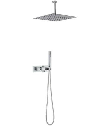 Cet ensemble réunit un beau mitigeur mural thermostatique à encastrer, avec sa douchette ultrapratique et un élégant pommeau de belle ampleur, à suspendre au plafond, pour une salle de bains très confortable et à votre goût. Caractéristiques : Mitigeur thermostatique encastrable - 2 fonctions - Matériau : laiton massif chromé - Profondeur minimale requise : 75mm - Installation : horizontale - Plaque de finition incluse - Design moderne - Robinets gravés - Robinet de gauche : Thermostat - Robinet de droite : Ouverture et contrôle du débit - Clip intégré pour le rangement de la douchette - Sécurité anti-brûlure - Cartouche homologuée aux spécifications EN1111 - Technologie : Disques céramique 1/4 de tour Douchette rectangulaire - Matériau : ABS - Finition chromée - Design moderne - Anti-calcaire - Surface distributrice d'eau en caoutchouc - Dimensions : H. 23.05 x L. 2.8 x P. 2.8cm - Flexible pour douchette - Gaine d'acier chromé de qualité. - Écrou de 18mm - Longueur : 175cm - Pomme de ...
