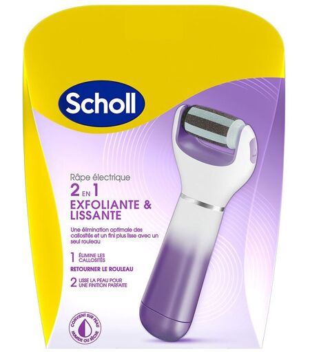 La Râpe Electrique Pieds Scholl 2 en 1 Exfoliante & Lissante adoucit la peau en éliminant les callosités dures et tenaces avec un côté du rouleau et en lissant avec le second côté. Grâce à son rouleau double action exfoliant et lissant, la Râpe électrique Pieds Scholl adoucit la peau en éliminant les callosités dures et tenaces en quelques minutes, vous permettant d'obtenir de beaux pieds que vous n'hésitez plus à montrer. C'est si facile à utiliser ! Faites des mouvements réguliers en exerçant une pression légère à moyenne sur les callosités et vous verrez la peau morte disparaître. Sa poignée au design ergonomique rend l'utilisation très agréable. Bénéfices Un rouleau 2 en 1 exfoliant et lissant Une poignée agréable au design ergonomique. Pour les callosités dures et tenaces, utilisez les rouleaux de remplacement Scholl Velvet Smooth™ Grain Ultra Exfoliant. Montrez à vos pieds à quel point vous les aimez en utilisant la gamme Scholl Velvet Smooth™ spécialement conçue pour eux. Conseils d'utilisation Première utilisation :1. Dévissez le socle de l’appareil dans le sens inverse des aiguilles d’une montre.2. Retirez le socle de l’appareil, puis enlevez la languette rouge de l’isolant.3. Remettez le socle de l’appareil en place, puis vissez dans le sens des aiguilles d’une montre jusqu’à ce qu’il soit bien fixé.4. Suivez les consignes ci-dessous pour une utilisation régulière.Utilisation régulière : 1. Vérifiez que le rouleau est bien enfoncé dans l’appareil. Ne pas utiliser sans avoir fixé le rouleau. 2. Allumez l’appareil en faisant tourner la bague grise métallisée à gauche, puis passez doucement le rouleau sur les callosités et la peau morte disparaîtra progressivement. A utiliser sur une peau séchée uniquement. N'appuyez pas trop fort, sinon l'appareil s'arrêtera.3. Éteignez et vérifiez si vous avez obtenu la douceur désirée. Sinon, rallumez l’appareil et recommencez l’opération jusqu’à parvenir à la douceur désirée. Attention: Ne passez pas sur la même zone plus de 3-4 secondes d’affilée. Arrêtez-vous en cas d’irritation ou d’inflammation de la peau.4. Éteignez l’appareil en tournant la bague grise métallisée vers la droite.5. Essuyez ou rincez vos pieds afin d’éliminer les résidus de peaux mortes qui restent.6. Séchez soigneusement vos pieds et appliquez une crème hydratante pour des pieds parfaitement doux.Nettoyage après utilisation : La Râpe Electrique Anti-Callosités Scholl Velvet Smooth™ aux Cristaux de Diamants* ne résiste pas à l’eau. Détachez et lavez le rouleau pour en nettoyer la surface. 1. Éteignez l'appareil.2. Retirez doucement le rouleau de l’appareil en appuyant sur le bouton de déverrouillage situé sur le côté.3. Rincez le rouleau sous le robinet.4. Nettoyez le corps de la râpe avec un chiffon propre et humide.5. Séchez le rouleau et la râpe avec un chiffon propre et sec.6. Remettez en place le rouleau*Diamants de synthèseRemplacer le rouleau : Remplacez le rouleau lorsque vous estimez que la râpe devient moins efficace.... ...