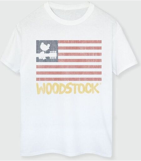 Brands In White Woodstock Flag Women Boyfriend Fit Music T-Shirt