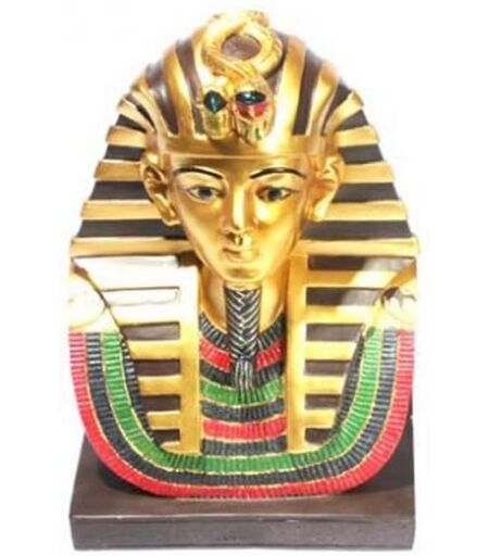 Le plus fameux de tous les Pharaons exhumés de la Vallée des Rois de l'Ancienne Egypte est Toutankhamon. L'enfant pharaon eût un règne précoce, et de courte durée (9ans). Il décéda en l'an 1343 avant J.C. d'une mort dont on ignore encore la cause. Son nom est très familier car sa tombe était en perfecte condition lors de sa découverte. Sa tombe fût pillée juste après son inhumation, mais tous les biens dérobés furent remis dans sa maison d'éternité. Chaque Statue Egyptienne est magnifiquement finie dans de lumineux jaunes or, bleus, verts et rouges. La finition est fidèle à celle du masque funéraire de Touthankamon, exposé au musée du Caire. Hauteur 21 x 13.5 cm Base 11.5 x 13 cm Resine ...