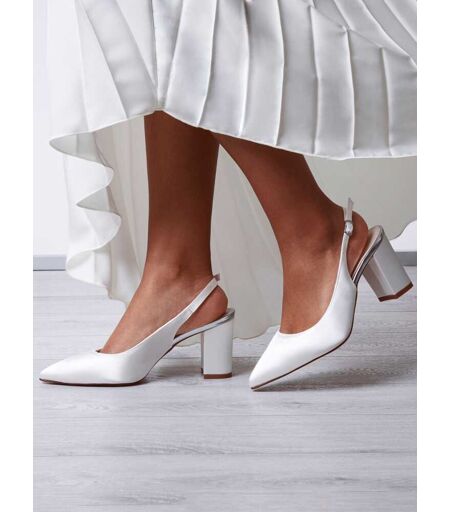 A sophisticated slingback court with a wide cut, the Faith bridal shoes are a new style for us this season. Made from lustrous ivory satin, which can be dyed to a colour of your choice, they have a sharply-pointed toe, an elasticated and buckled slingback strap for a great fit, silver leather trim detail and a wear-all-day block heel. A great wedding shoe whether you're a bride, bridesmaid or mother of the bride, keep it simple, or try them with our new collection of jewel, pearl, bow and feathe ...