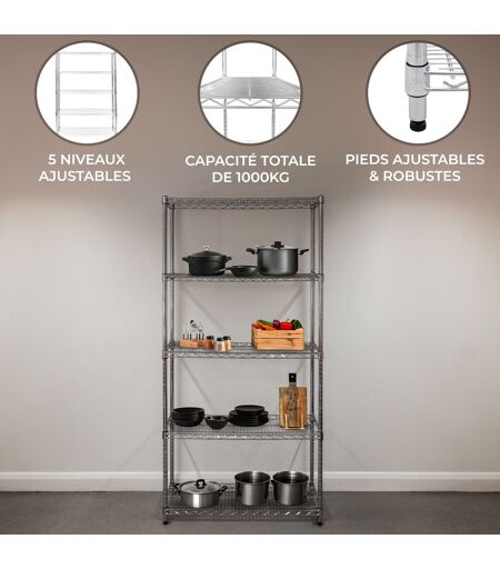 Acier de carbone chromé robuste Généreuse solution de stockage sur 5 niveaux Capacité de charge impressionnante de 1000 kg Étagères réglables en hauteur Pieds de nivellement adaptables ...