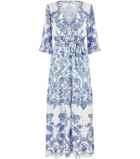 This sublime maxi dress really does shout for the sun. The gorgeous all-over paisley print will look perfect on any beach front bathed in sunlight, With a wrap over style neckline, tie at the waist and pretty frill embellished 3/4 sleeves. We also love this style for a wedding guest fit for an alternative to florals. The prettiest paisley print maxi dress. Wrap dress style with 3/4 frill sleeves. Perfect for your holiday suitcase this season. Machine washable. 100% Polyester. ...