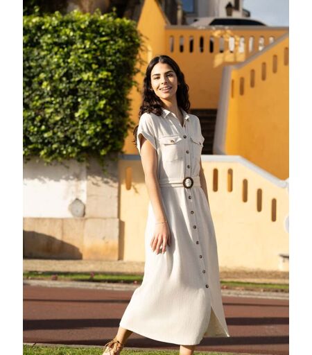 Yumi Yumi Natural Viscose Look Midi Shirt Dress With Wooden Belt Natural EU 44 (UK 16)