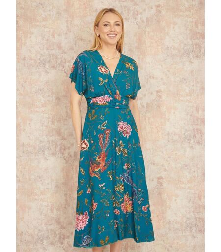 Yumi Yumi Robe mi-longue kimono à imprimé floral et oiseau en viscose Bleu EU 36 (UK 8)