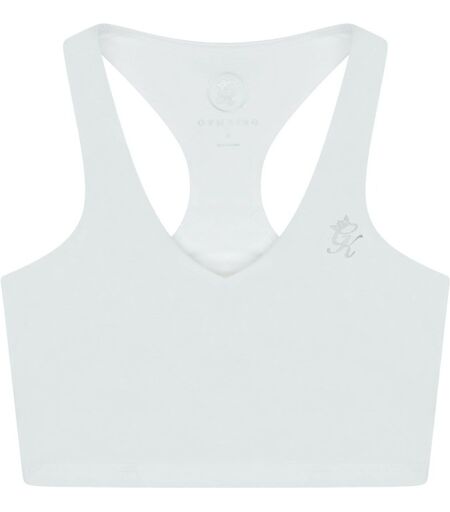 Crafted for style and support, this tight-fit sports bra offers medium support and a flattering V-Neckline-perfect for training sessions or active days. The racerback design allows for full range of motion, while the soft-touch fabric provides a smooth, comfortable feel against the skin. Reflective silver Gym King logo on the chest and linear branding on the back add a sleek, high-performance edge with enhanced visibility. Designed with sweat-wicking technology, it keeps you cool, dry, and confi ...