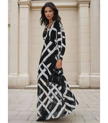 The Lily Maxi Column Dress features a flattering deep V-Neck, elegant sheer batwing sleeves, and a flowing bias-cut skirt part. Offered in our hand-painted abstract Monochrome Selvage print, it's an effortless choice for any occasion-sophisticated, easy, and striking. The model wears a size UK 10. Length from the top: 140 cm. Machine washable. Shell 100% Polyester. Lining 100% Viscose. ...