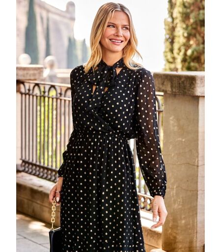 Part of our branded range, delivered by NEXT. Your am to pm party piece, scattered with shimmering gold spots, comfy elasticated waist - perfect for eating drinking and dancing, sexy sheer blouson sleeves, topped with a chic neck tie, style with strappies or knee-highs and a faux fur jacket. Model is 5ft 9in and wears a UK size 8. Hand wash only. 96% Viscose, 4% Metallised fibre. ...