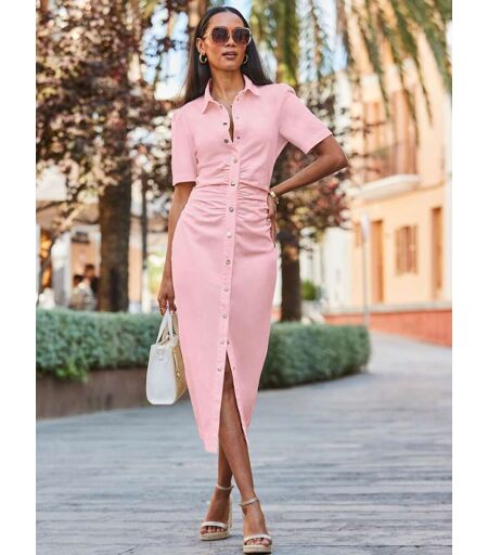 Sosandar Sosandar Pink Ruched Waist Popper Front Denim Dress Pink EU 42 (UK 14)