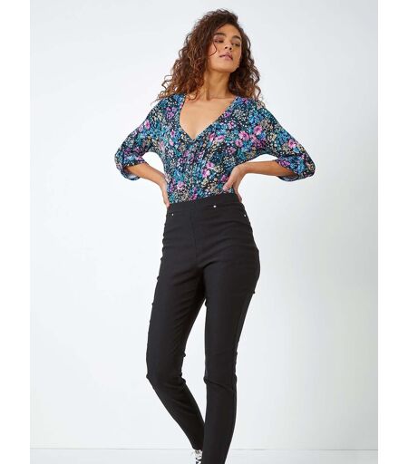 Our stretch trousers are a firm Roman favourite and we've given them a denim twist! Cut from the same comfortable, stretch fabric we know and love, these trousers feature mock pockets, back patch pockets and studs, giving them a real denim feel. An elasticated waistband makes them easy to pull on and go. Designed in a straight leg style, these trousers are finished with a stylish split hem. A really versatile staple that you can pair with anything from printed blouses to casual t-shirts! Lavable ...