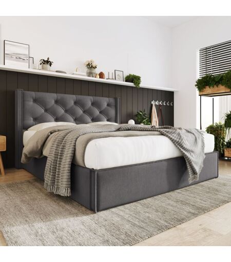 Description Apparence minimaliste et élégante Avec les tissus en coton gris et la tête de lit à ailes, ce lit coffre possède une apparence minimaliste mais élégante, il s’adapte parfaitement à votre chambre à coucher ou chambre d’ami. Grand espace de rangement Grand espace sous le sommier à lattes relevable grâce à la barre hydraulique vous permet d’y mettre des boîtes de rangement ou des bagages. Tête de lit confortable La tête de lit rembourrée est très agréable, vous pouvez y vous adosser confortablement pendant la lecture ou la télévision. Obstacles pour empêcher le matelas de glisser Les deux obstacles en forme de poignée sont conçus pour empêcher le matelas de glisser quand vous soulevez le sommier, qui est très humanisé. Sommier à lattes stable Avec des pieds centraux, le sommier à lattes possède une construction robuste et stable. Le lit est donc capable de résister à l'épreuve du temps. Remarques - Ce produit est divisé en 2 colis pour la livraison. Il se peut qu'ils ...