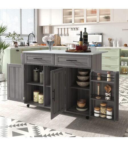 Chariot de salle à manger/buffet de salle à manger, comptoir en marbre blanc et armoire à grain de bois gris kaki, extensible, 129x46(71)* 91.5(95)cm ...